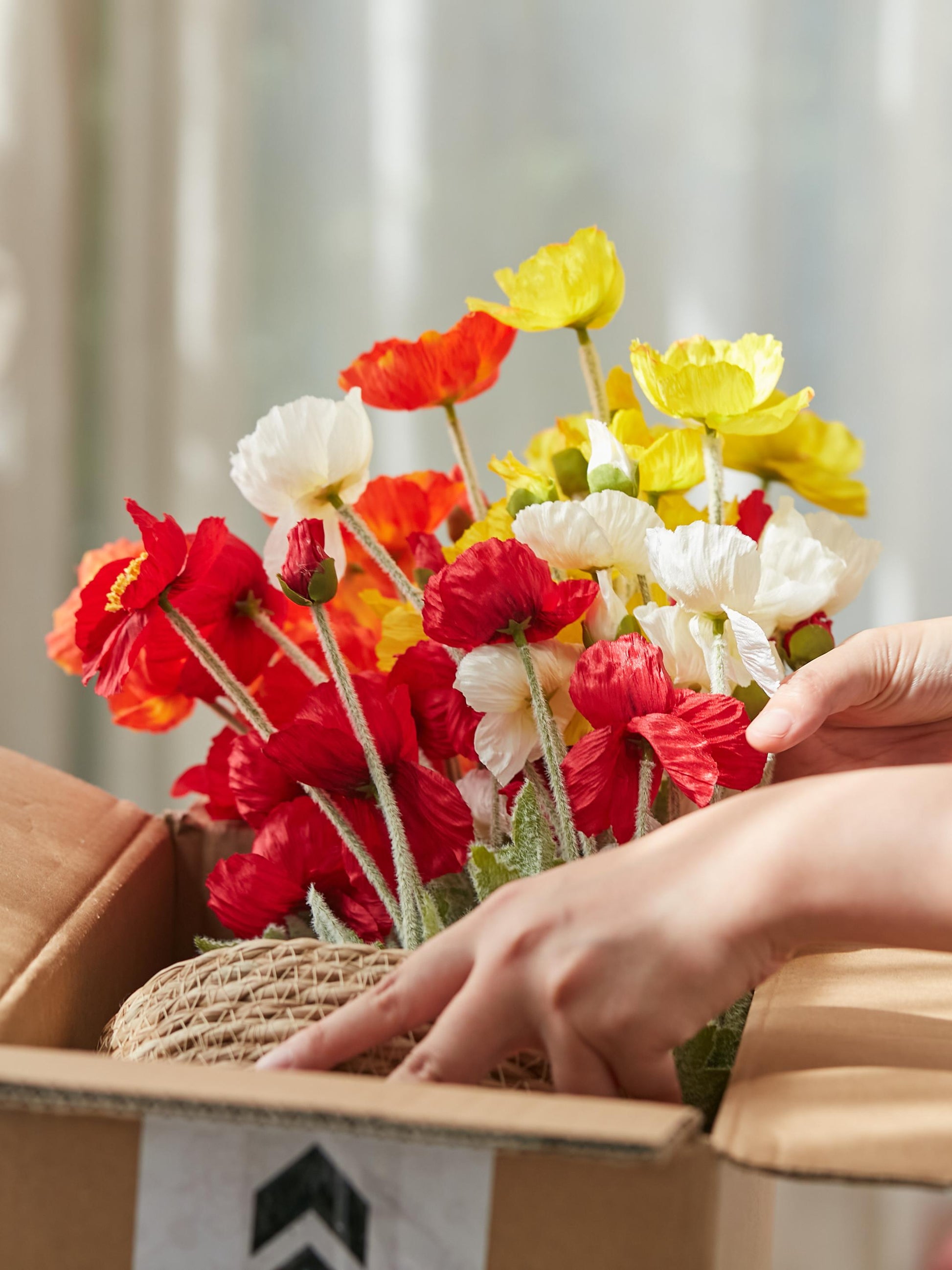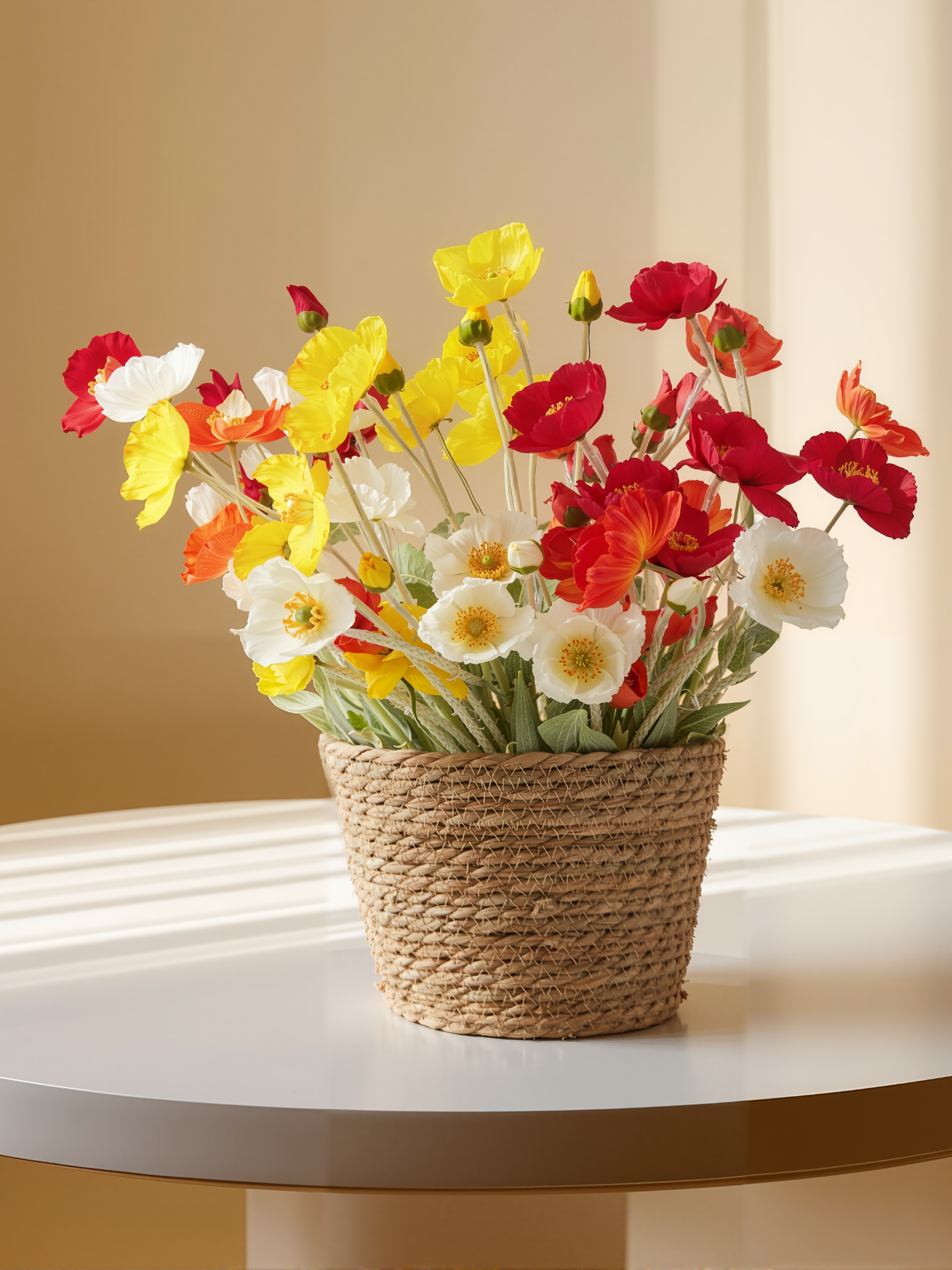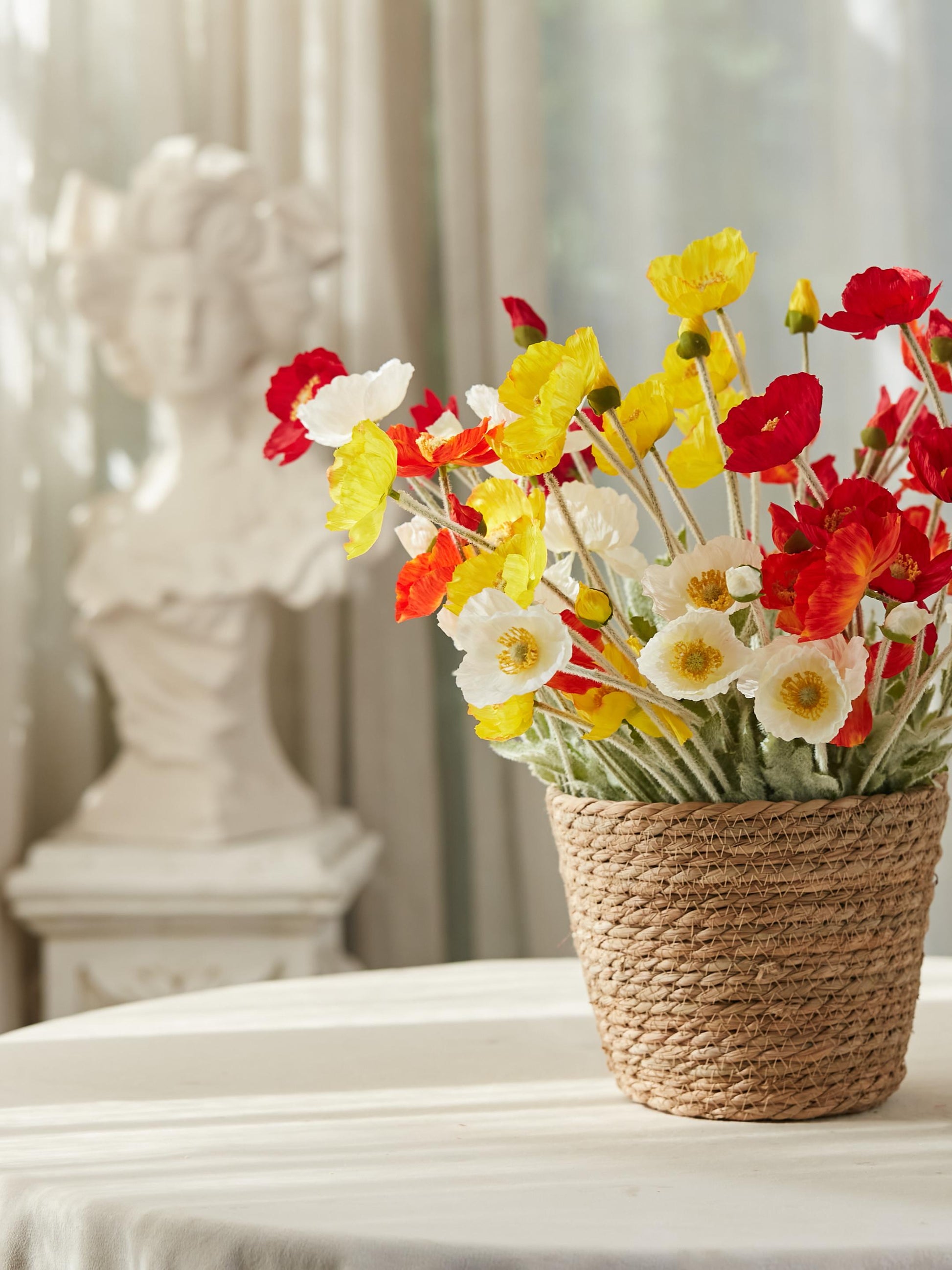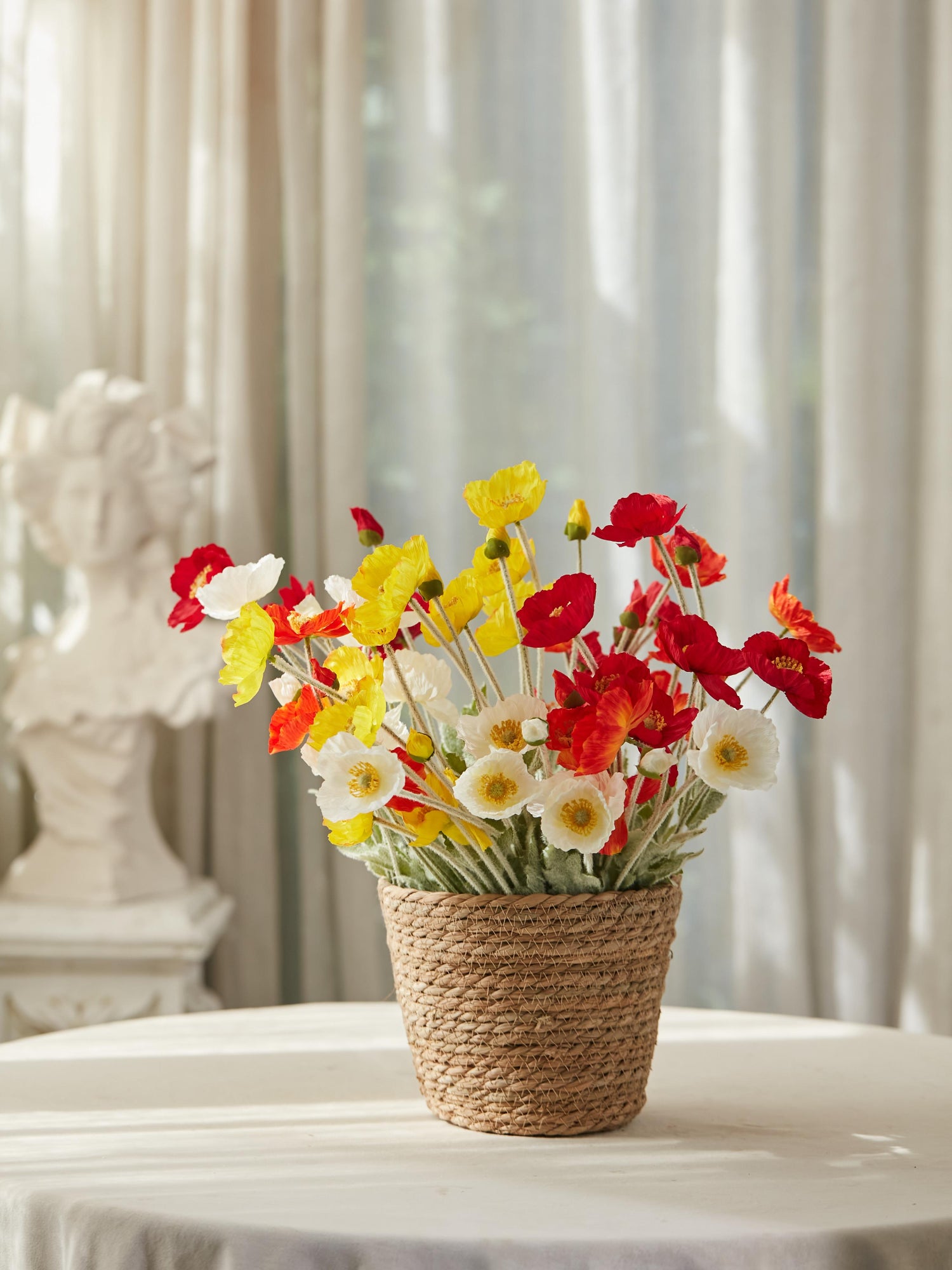 Ilumina tu espacio con este vibrante arreglo floral de seda con 16 tallos (64 flores bañadas por el sol) en radiantes tonos rojo, blanco, amarillo y naranja. Presentados en una cesta de ratán natural, estos tallos de aspecto natural aportan alegría y energía a cualquier habitación.