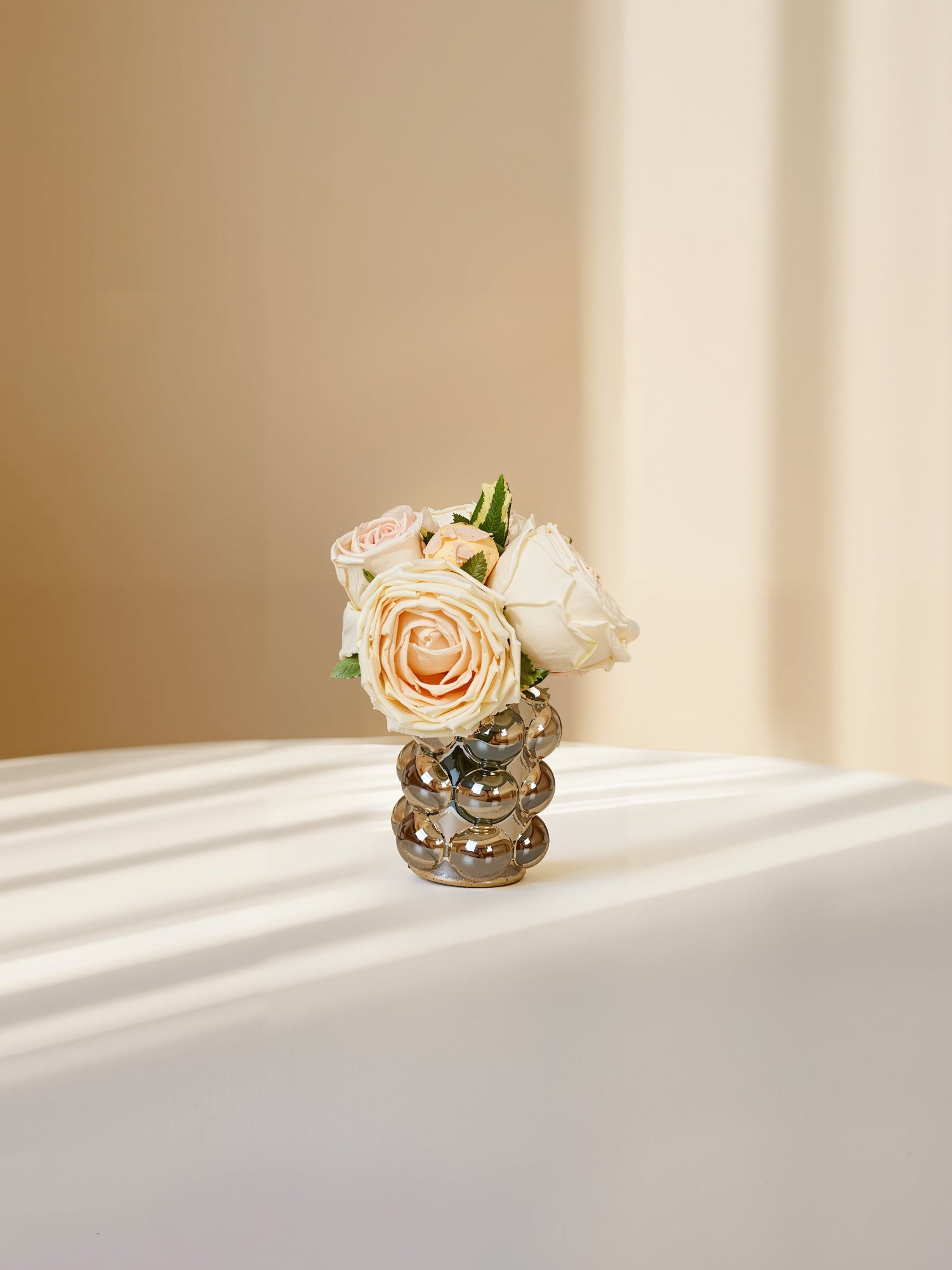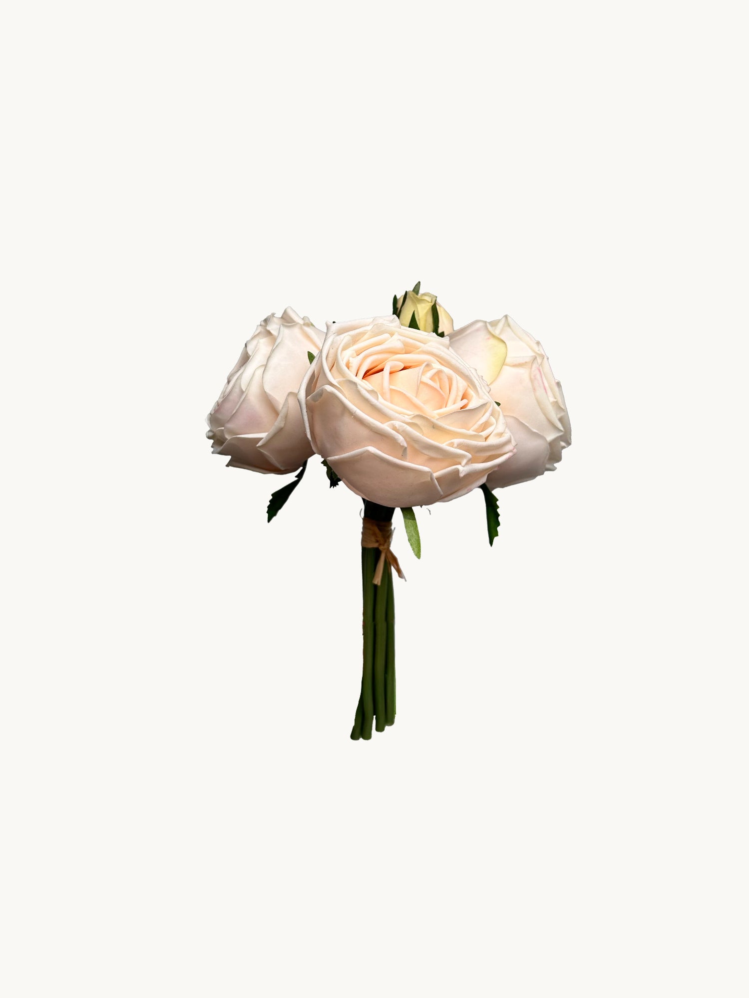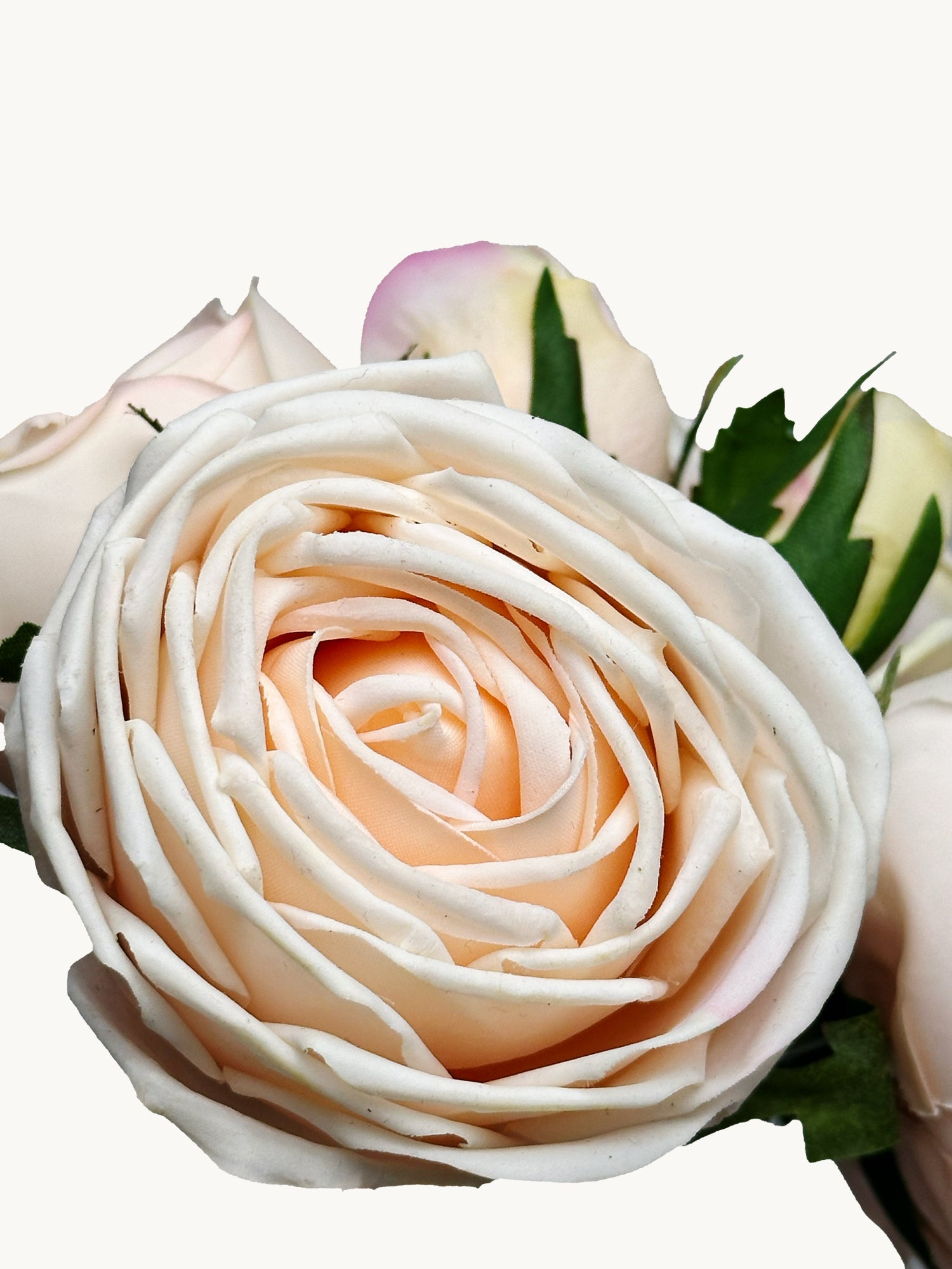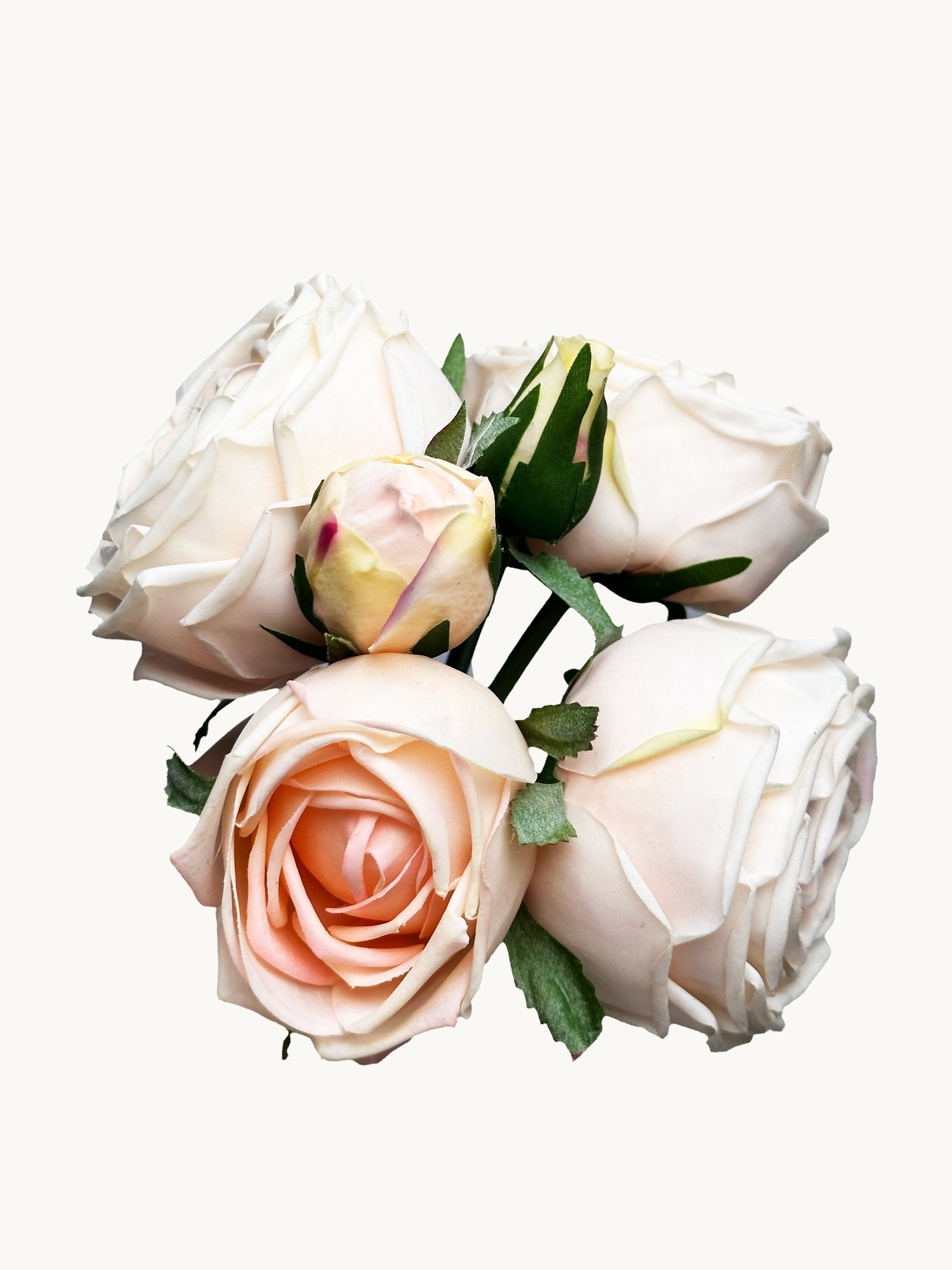 - Seis tallos realistas elaborados con tela de mezcla de seda con un suave tono champán.
