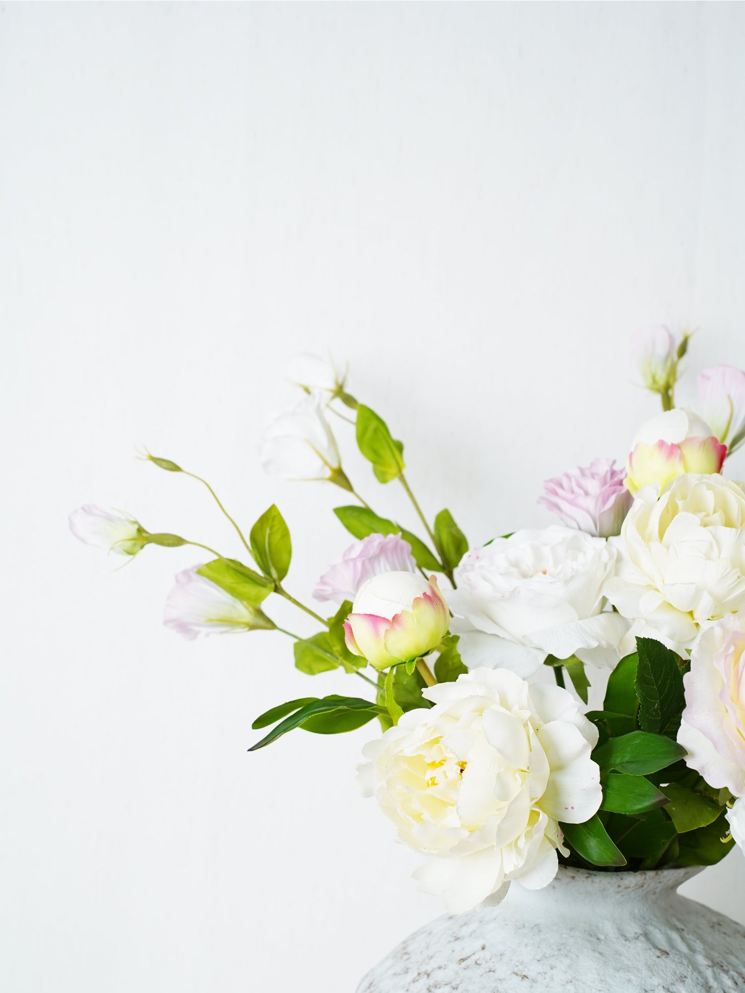 - Elegante mezcla de peonía, rosa Austin y flor de globo en suaves tonos pastel.